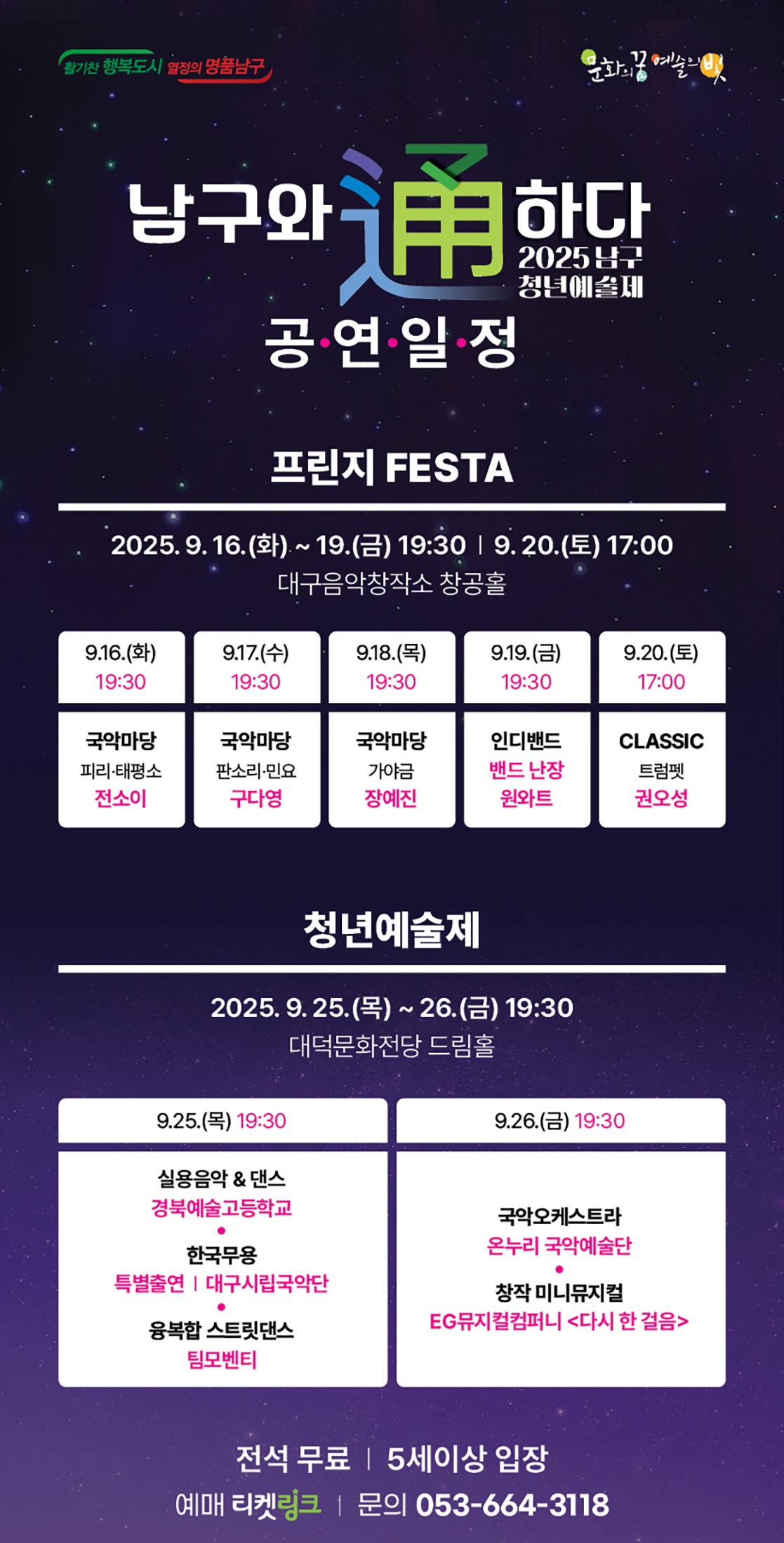 | [25.09.16. - 25.09.20.] 2025 남구청년예술제 <프린지 FESTA> (0) | 2025.08.29 |