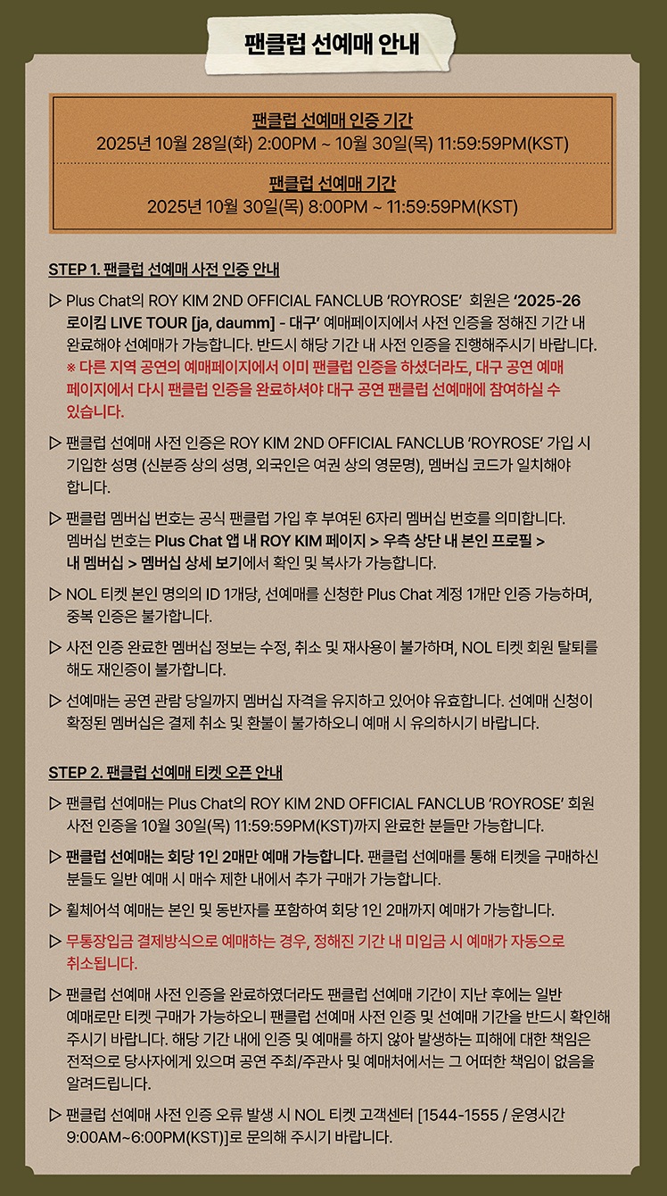 1. 팬클럽 선예매 인증 기간 ▶ 2025년 10월 28일(화) 2:00PM ~ 10월 30일(목) 11:59:59PM(KST)